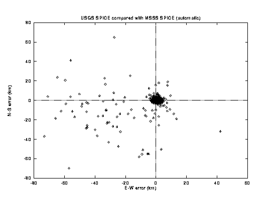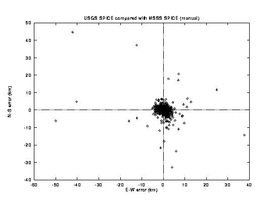 Roughly 3,500 images in the dataset correspond to images for which updated SPICE information exists from the USGS MDIM production process. This information can be used as an independent test of the quality of the MOC dataset. The following plots show the difference between the USGS and the MSSS SPICE for 1,699 automatically-registered and 1,952 manually-registered images. Each point is the average difference of the planetary coordinates of 16 principal points on the image plane, obtained using the USGS and MSSS C matrices.