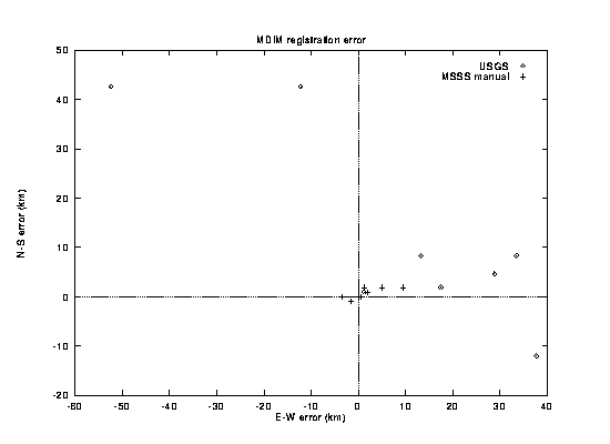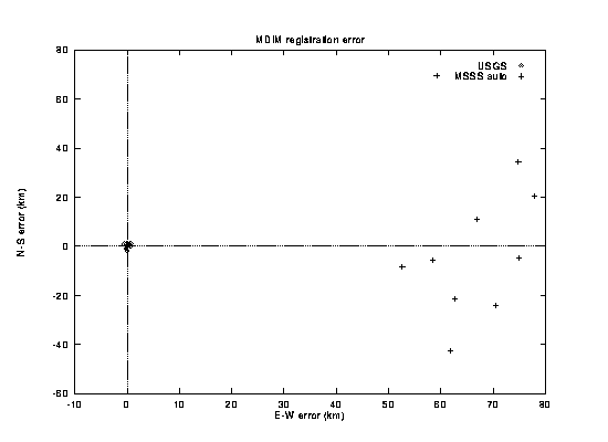 The use of the MDIM in this manner raises the question of the MDIM's accuracy. While the USGS control net served as a basis for control of the MDIM, it is stated in the MDIM documentation [Eliason91] that