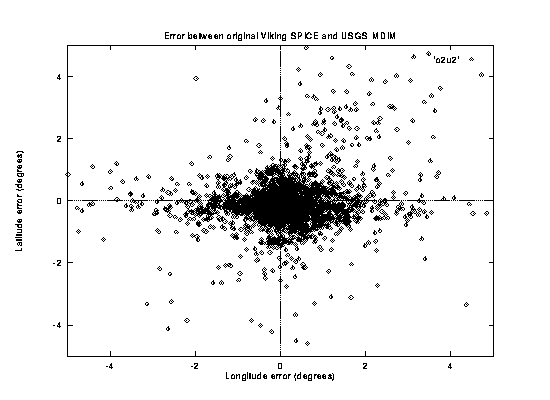 Assessing the quality of the SPICE data is difficult. The earliest version of the Viking SPICE data available at MSSS is that delivered with the PICS image processing system from USGS. (Although we believe that this dataset was derived from the original JPL SEDR dataset, there appear to be some discrepancies between the two; we have been unable to obtain the original SEDR to examine the differences.) We also have 5,293 updated SPICE kernels computed as a side-effect of the MDIM production process; these are available on the CD-ROM volume USA_NASA_PDS_VO_2007. The quality of the original dataset, for these images, can be gauged by computing where a fixed point on the camera's focal plane intersects the planet for each image, and examining the differences between the results using the original and the MDIM-produced SPICE data. This reveals some errors of over 60 degrees in latitude and 150 degrees in longitude, but 98% of the images have errors of less than 5 degrees. The errors are plotted below.