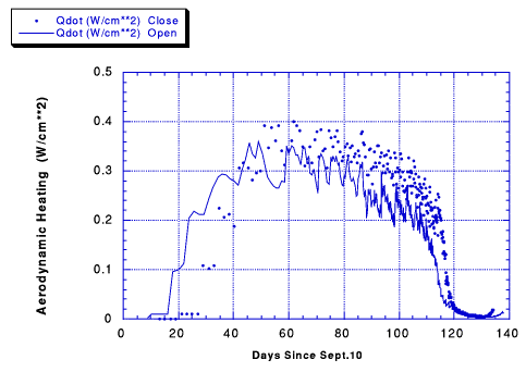 The aerodynamic heating rate is larger for the close of the launch period because both cases follow the same local solar time plot (Figure 5.6) to reach the 2:00 p.m. orbit, but fewer days are available for aerobraking for the close case because it arrives at the planet 11 days later than the open case, but must finish aerobraking at about the same date. (Actually, the close of the launch period trajectory finishes aerobraking four days earlier than the open.) Thus, more energy must be removed each orbit in order for the close trajectory to remove the same amount of energy from the orbit in fewer days.