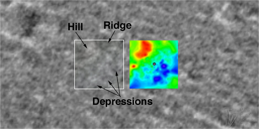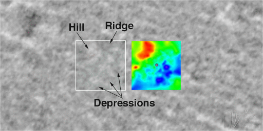 Low areas--depressions--are blue and purple, high areas--hill--are