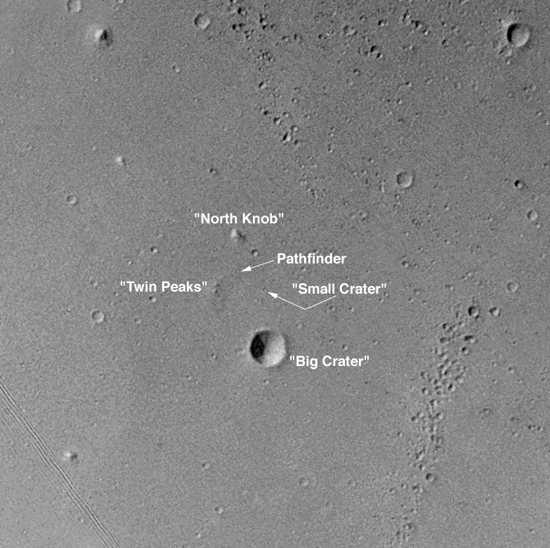 The features labeled here were visible from the Mars Pathfinder