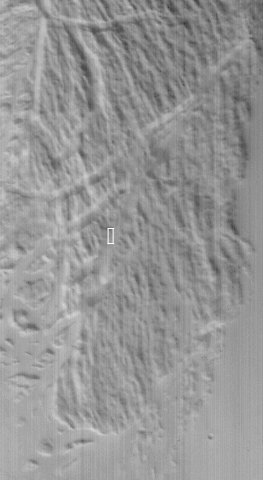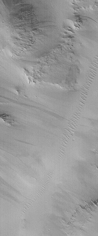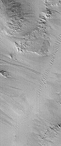 MOC's 100,000th image, E10-00678 (left), was received on November 5, 2001. Its context frame (right) was received at the same time. The 100,000th image is located near 24.2°N, 127.4°W, in Cyane Sulci, a grouping of ridges northeast of the giant volcano, Olympus Mons. The picture (above left) shows a valley running diagonally from near the upper right to the lower left, the floor of which is covered by windblown dunes. The slopes on either side of the valley show dark streaks of debris that have slid down from the surrounding ridges. The image has fairly low contrast and a streaked appearance because the atmosphere of Mars was still somewhat hazy following a series of large dust storms that nearly obscured the planet between July and October 2001. Both images are illuminated from the lower left, the high resolution view (left) covers an area 1.5 km (0.9 mi) across, the context view (with white box to indicate location of high resolution view) covers an area 63 km (39 mi) across.