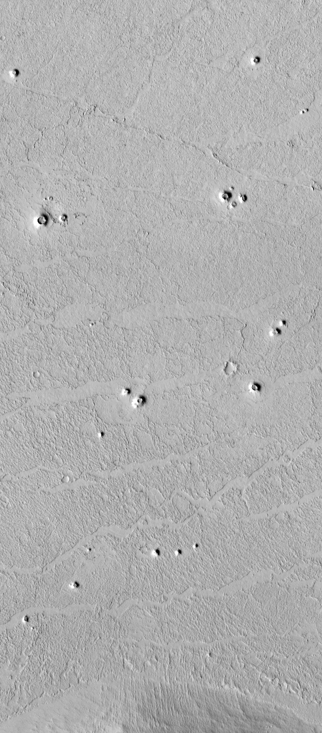 The surface shown here (above right) looks relatively fresh and has very few impact craters on it, which suggests that the lava flows and the cones are both geologically young. However, MOC images in other areas reveal such apparently young surfaces being exhumed (presumably by wind erosion) from beneath a blanket of overlying material. Impact processes may harden the blanket, or cover it with materials that cannot be removed by wind, so the wind erosion leaves behind elevated "pedestal craters". The cones shown here are not typical of pedestal craters, but it is important to consider this alternative interpretation.