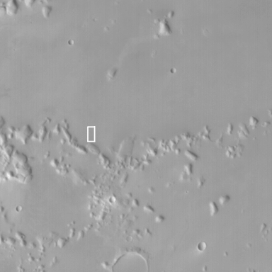 The white box in the picture above left shows the location of one of the MOC images of possible psuedocraters on Mars. The white box is drawn upon a MOC red wide angle context image acquired at the same time as the high resolution view, shown on the right above. Located in northwestern Amazonis Planitia near 24.8°N, 171.3°W, both the context image and high-resolution view are illuminated from the lower left. The high resolution view shows several possible psuedocraters (cone-shaped features with holes or pits at their summits) that occur on top of a rough-textured lava plain. The context frame covers an area 115 km (71 mi) across, the high-resolution view is 3 km (1.9 mi) across.