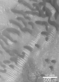 This Mars Global Surveyor (MGS) Mars Orbiter Camera (MOC) image illustrates an intriguing martian "find". Strangely, the two dune types have different shapes and a different relative brightness. There are two explanations for the relationship seen here, and neither can be distinguished as "the answer"---(1) it is possible that the brighter dunes are old and cemented, and represent some ancient wind activity, whereas the dark dunes are modern and are marching across the older, "fossilized" dune forms, or (2) the bright dunes are composed of grains that are much larger or more dense than those that compose the dark dunes. In the latter scenario, the bright dunes move more slowly and are over-taken by the dark dunes because their grains are harder to transport. An interpretation involving larger or denser grains is consistent with the small size and even-spacing of the bright dunes, as well, but usually on Earth such features occur on the surfaces of larger, finer-grained dunes, not under them. The actual composition of either the bright or dark materials are unknown. This example is located on the floor of an impact crater in western Arabia Terra at 10.7°N, 351.0°W. The picture is illuminated from the right.