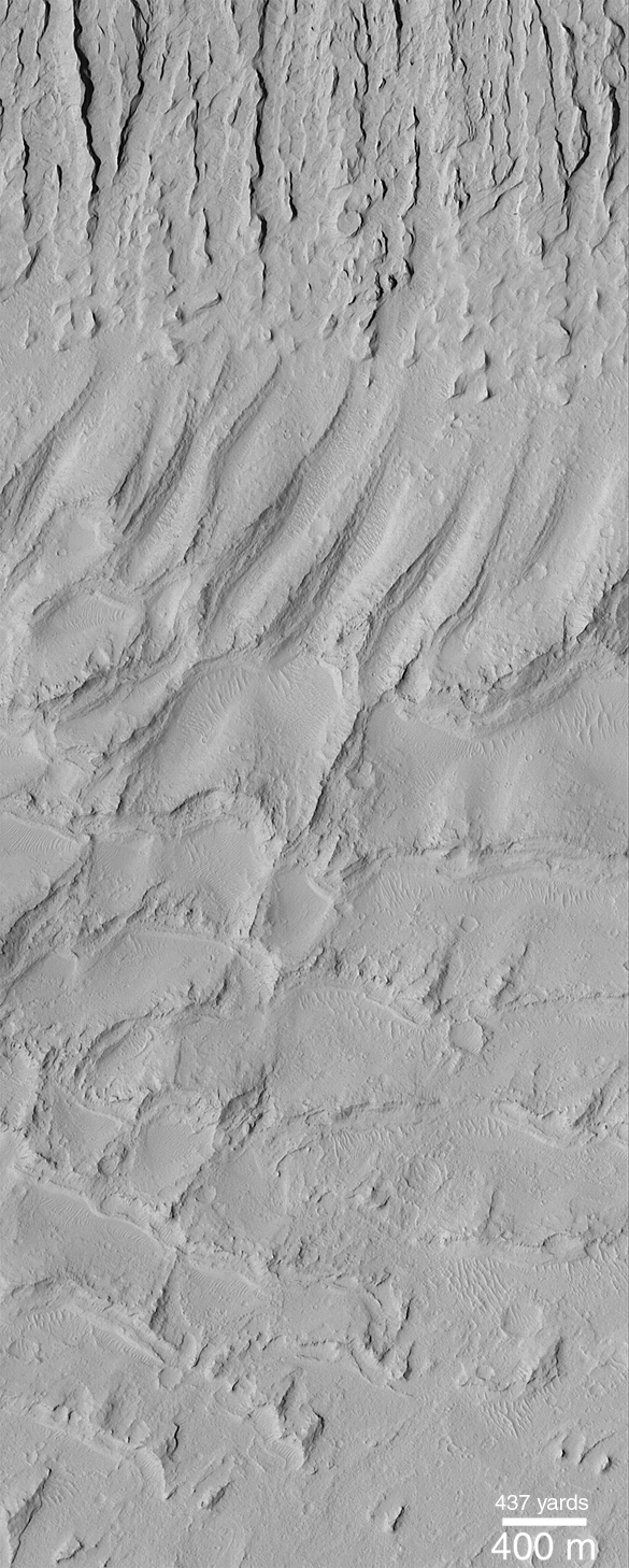 The field of parallel ridges north of the dune field (above the white boxes in picture at the left) is a wind-eroded material named the Apollinaris Sulci. It is possible that the dune field shown here was once covered by this wind-eroded material and was later exhumed. Regardless, the dunes were somehow hardened and have been exposed as hard rock on the martian surface long enough for many impact craters smaller than a few hundred meters (few hundred yards) across to form. These dunes are therefore quite ancient---one might say that this is a 'fossil' dune field. A similar effect at a much smaller scale can be seen by examining some sandstones and siltstones on Earth---if conditions were right, ripples formed in either water or wind are preserved in such rocks.