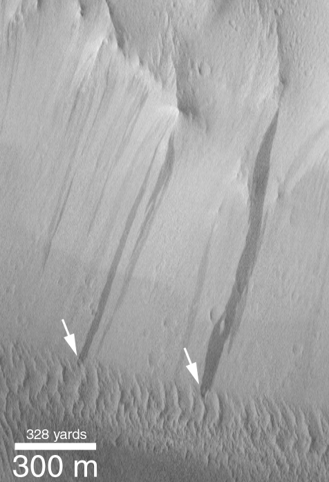 In this case, the dark slope streaks have moved up and over the dunes at the bottom of the slope, indicating that the process that moves sediment down the slope is more active (that is, it has occurred more recently and hence is more likely to occur) in the modern environment than is the movement of dunes and ripples at this location on Mars. The dunes, in fact, are probably mantled by dust. This October 1997 Mars Global Surveyor (MGS) Mars Orbiter Camera (MOC) picture is illuminated from the left and located near 31.6°N, 134.0°W.