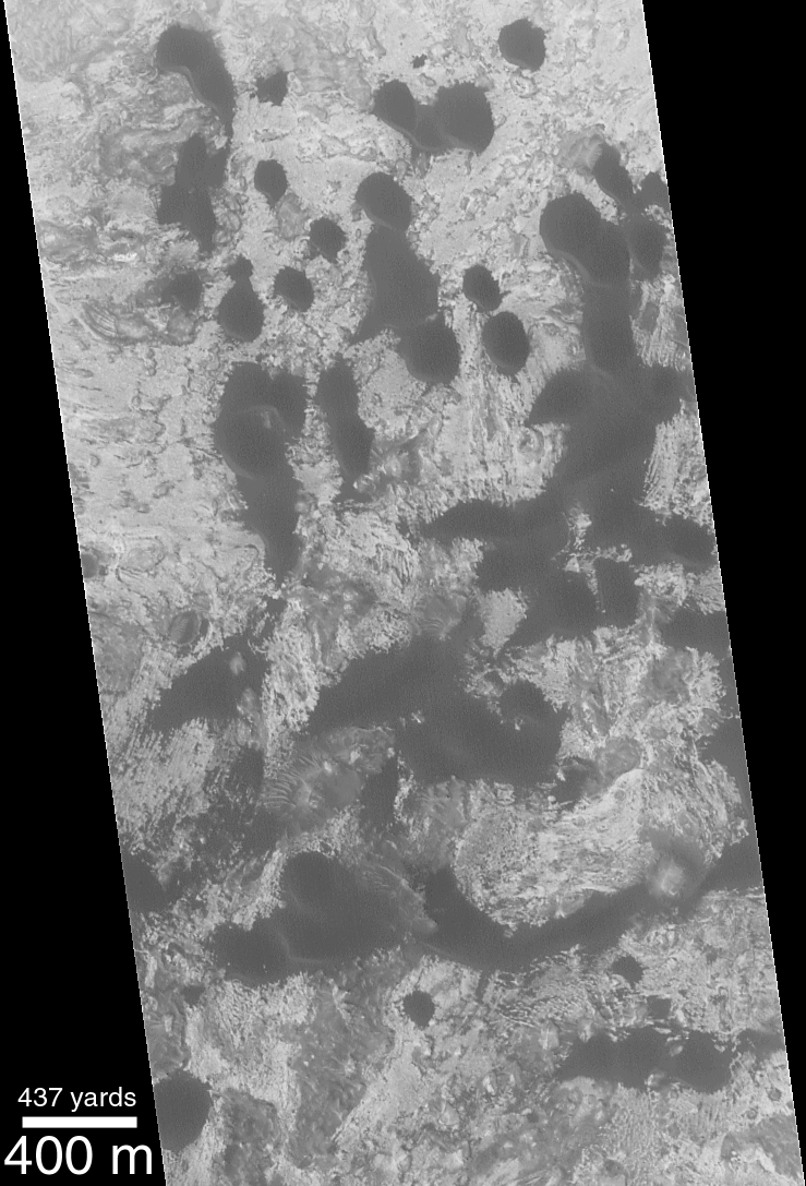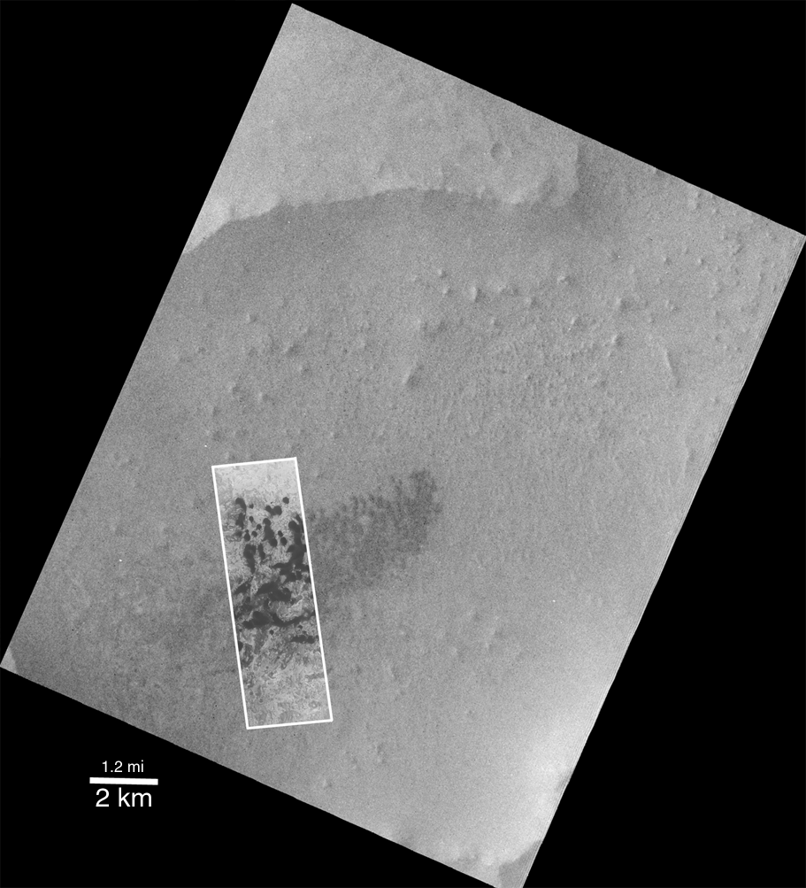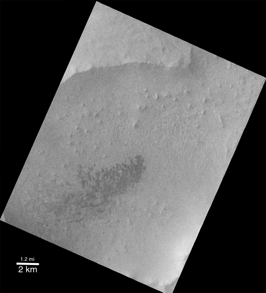 The picture above right shows the MOC image from December 1999 superimposed on a Viking 1 image taken May 27, 1978. During the 11 1/2 Mars years that passed between these two dates, it turns out that no difference can be detected in the position of the dunes seen in the MOC image and the Viking image. (Click Here for a view of the Viking Image without the MOC image). The earlier Viking image had a resolution of about 17 meters (56 ft) per pixel, while the MOC image had a resolution of about 3.8 meters (12 ft) per pixel. Although it looks like the dunes didn't move between the Viking and MOC images, this observation is limited by the resolution of the Viking image. It is entirely possible that the dunes have moved as much as 17-20 meters (16-66 ft) and one would not be able to tell by comparing the images. As it is, movement of less than 20 meters (66 ft) in 11 martian years (nearly 22 Earth years) is slower than some dunes of similar size and shape on Earth. Thus, it appears that martian dunes are not "experiencing" the level of activity commonly reported for some of the modern desert dunes found on Earth. The dune field illustrated in these pictures is located in a western Arabia Terra crater at 1.6°N, 351.6°W. Both the Viking and MOC images are illuminated from the left.