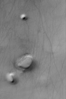 This Mars Global Surveyor (MGS) Mars Orbiter Camera (MOC) image shows a mesa and two hills--each of them a remnant of formerly more extensive layered material--in the south polar region of Mars. The dark streaks were formed by passing dust devils. This picture is located near 64.6°S, 340.5°W. The image covers an area about 3 km (1.9 mi) across. Sunlight illuminates the scene from the upper left.