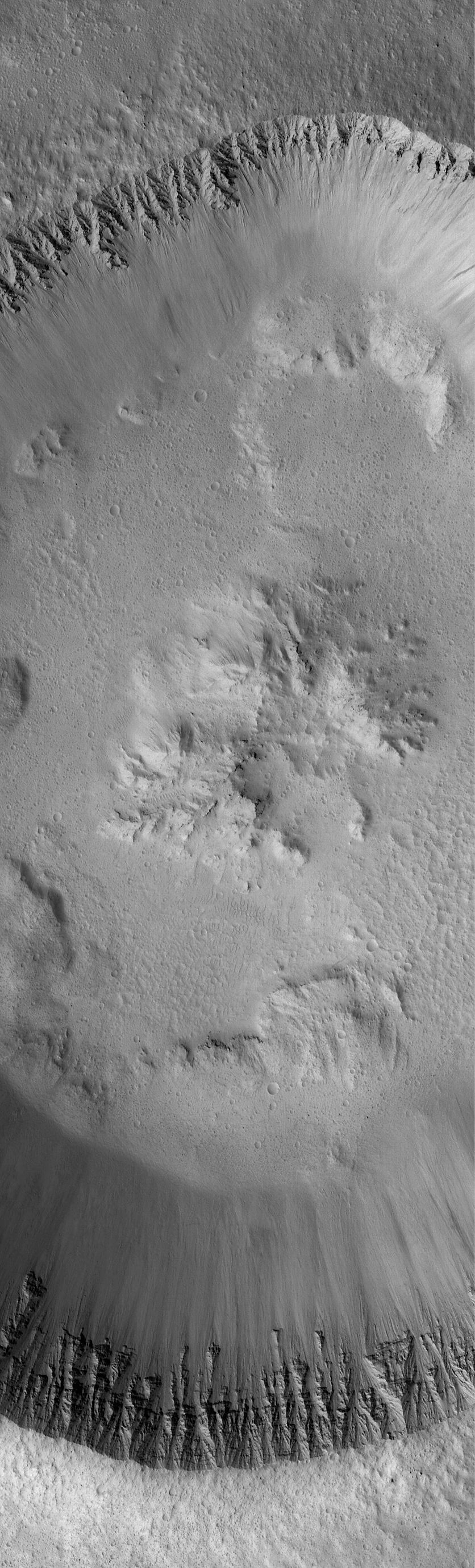 This Mars Global Surveyor (MGS) Mars Orbiter Camera (MOC) image shows fine details in the walls and floor of a meteor impact crater located immediately west of the Lycus Sulci ridged terrain, northwest of the volcano, Olympus Mons. The walls of the crater exhibit the finely-detailed layering of the local bedrock. This crater is centered near 31.4°N, 147.7°W. The image covers an area approximately 3 km (1.9 mi) across and is illuminated by sunlight from the lower left.
