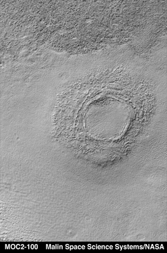 the lower, darker surface. The small crater that dominates this