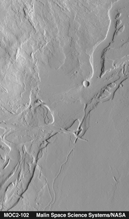 on the plains southeast of Olympus Mons. Lava flows are visible in the