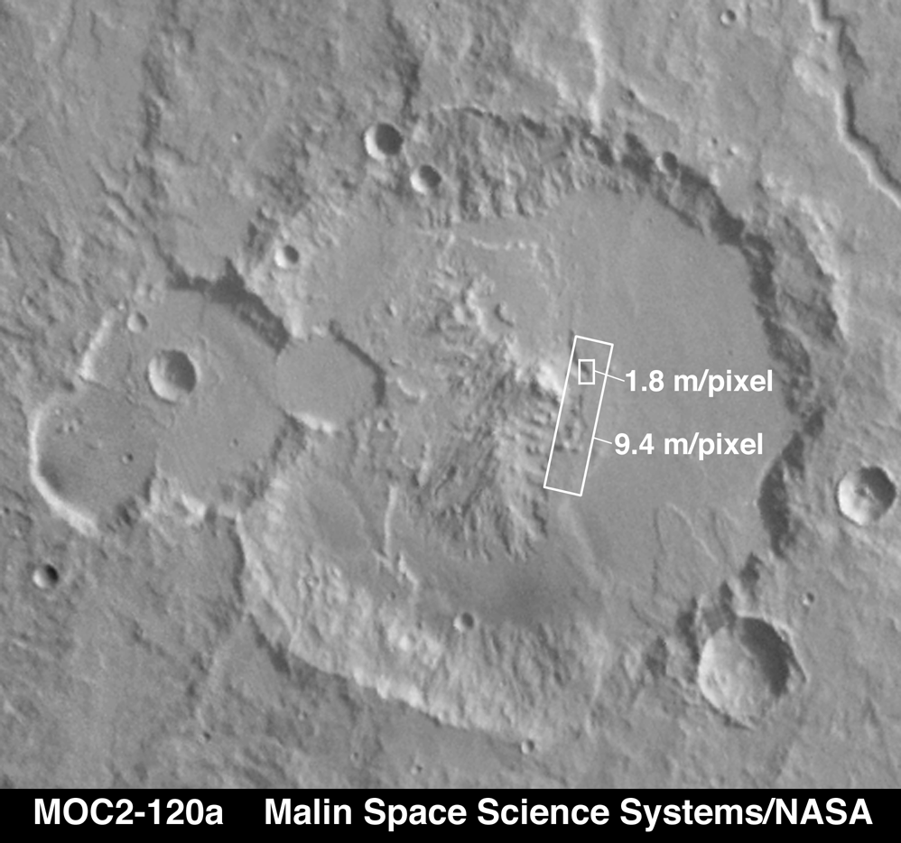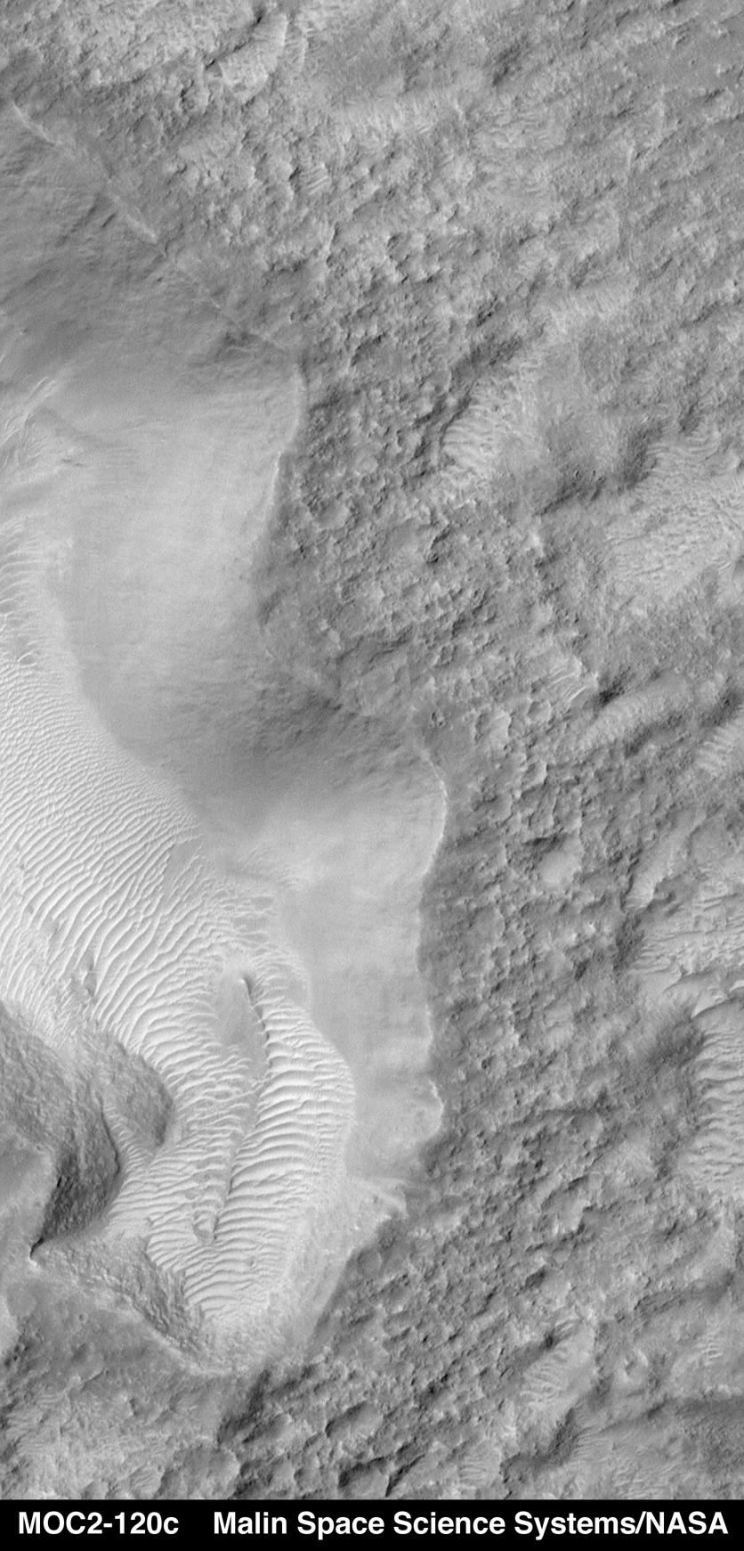 The new high resolution image (right) covers an area only 1.5 kilometers (0.9 miles) wide and shows that the crater floor--which appears relatively smooth in the context view on the left--is actually quite rough at the scale that a human being would notice if trying to hike around in this landscape. The latest picture also shows small, bright windblown dunes that were not visible in the earlier MOC image.