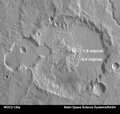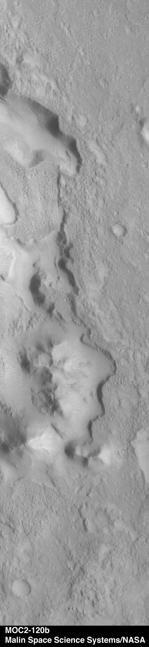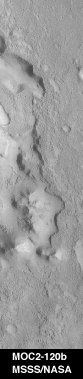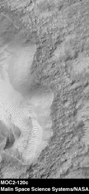 MOC2-120a is a mosaic of Viking Orbiter images 381s62 and 379s47, and MOC2-120b is a subframe of MGS MOC image SPO-2-382/04. The large white box shows the location of MOC2-120b, and the small white box shows the location of MOC2-120c. In MOC2-120a and MOC2-120b, illumination is from the right/upper right, in MOC2-120c it is from the left.