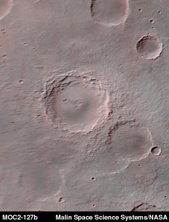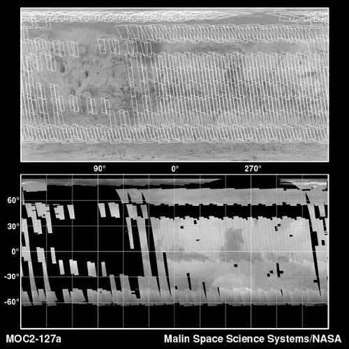 Owing to the nature of the MGS orbit, the groundtrack returns to within about 30 km of a given orbit 88 orbits (about one week) later. Thus, it takes a week to build up global coverage at full resolution. Figure MOC2-127a shows the planning map of coverage during the first week of the campaign (top), and the resulting actual coverage (bottom). Gaps caused by recorder playbacks must be filled in a second week of imaging by moving the times of the playbacks. Also in the second week, stereo coverage is acquired by re-imaging areas from adjacent orbits at a side-looking angle. Figure MOC2-127b shows an example of such stereo from the Mare Tyrrhenum region, centered at 27.3°S, 227.0°W (NOTE: Red-blue glasses are needed to view the stereo effect). The crater that dominates the center of Figure MOC2-127b is about 50 kilomters (31 miles) across. Stereo coverage will be completed in the third and fourth weeks. The remaining data volume will be used to fill in gaps created by data losses, and to acquire a somewhat lower resolution global color image through the blue wide angle camera.
