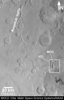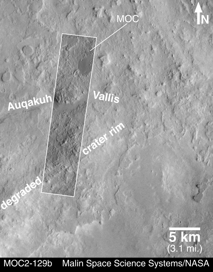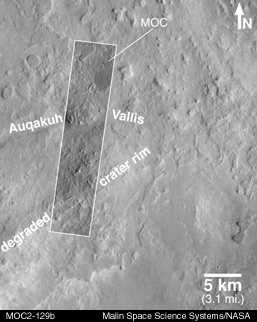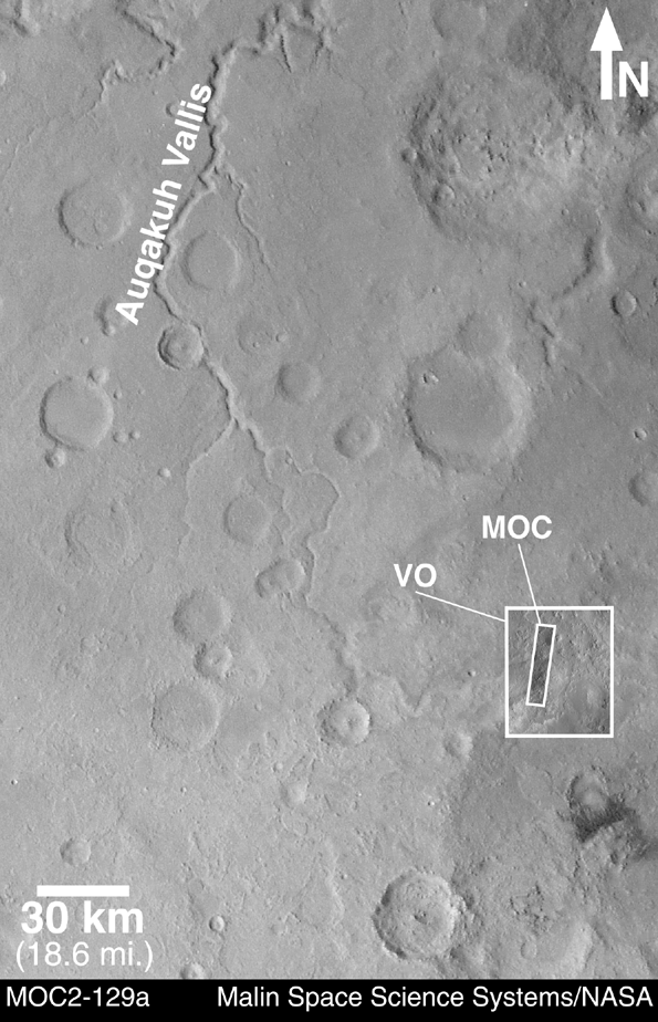 Eastern Arabia Terra is a region that was known from the Viking orbiter missions (1976-1980) to show vast tracts of eroded terrain. The image on the left, above, shows a regional view from Viking. Eastern Arabia is distinct for its rough-textured cratered terrain, and for the presence of the ancient, perhaps water-carved valley, Auqakuh Vallis. The center image (above) includes a high-resolution view from the Viking 1 orbiter, with a more recent image from the Mars Global Surveyor (MGS) MOC shown as an inset.