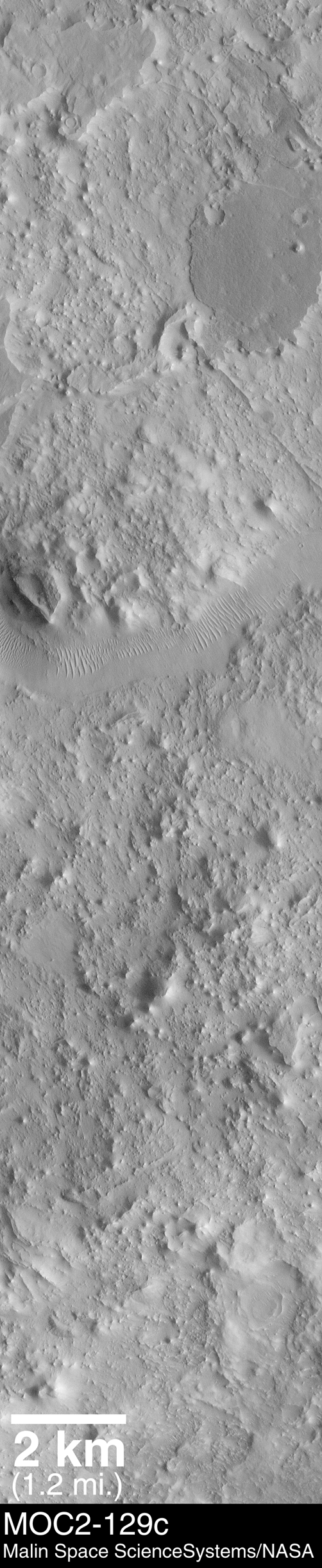 The third image (above, right) is a MOC high resolution view that shows a portion of the ancient Auqakuh Vallis (just above center) and many eroded remnants of the ancient cratered terrain. The MOC image reveals dunes on the floor of Auqakuh Vallis, and shows a plethora of small, straight and curved ridges running across the terrain. The geological term for these ridges is "dike". Dikes most commonly form on Earth in volcanic terrain, when molten rock (magma) is injected into a crack in the subsurface. The magma cools, hardens, and later erosion removes the surrounding rock to leave behind the more resistant volcanic rock as a ridge. Shiprock in the northwest corner of New Mexico, U.S.A., is an example of a place on Earth where dike ridges are found. This MOC image is one of many that are being examined by the MOC Science Team in order to decipher the ancient geological history of the red planet.