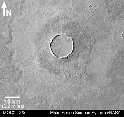 in Utopia Planitia at 44°N, 258°W, is shown on the left (MOC2-136a)