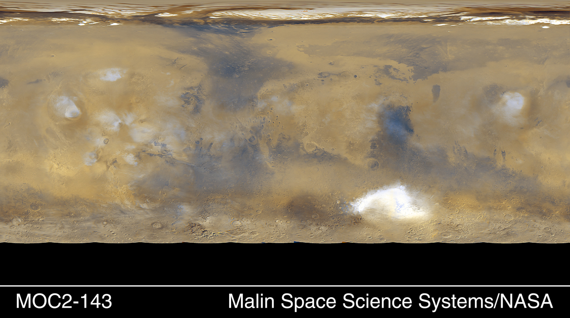 Here, bluish-white water ice clouds hang above the Tharsis volcanoes
