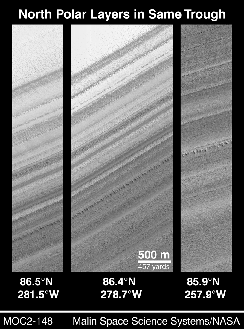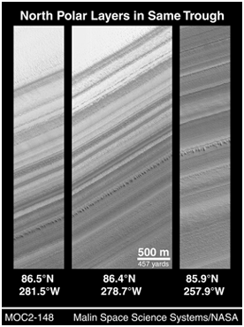 Shown here are three different images taken on three different orbits over the north polar cap in April 1999. Each shows a different part of the same ice-free trough. The left and right images are separated by a distance of more than 100 kilometers (62 miles), and the latitude and longitude of each is indicated beneath the images. Despite the distance that separates these three samples of the polar cap, similar sequences of layers can be seen in each. More detailed studies of the north and south polar caps are underway by the MOC science team. For nearly three decades, these layers have been thought to consist of a mixture of ice and dust that record a history of the planet's most recent (i.e., the past few tens of millions of years) climate history. Each image in this picture is illuminated from the upper right, and the layers are expressed as series of rough-textured troughs and ridges.