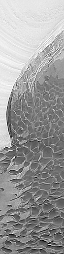 The new views of the martian north polar cap obtained in 1999 and 2001 suggest that it may not contain as much water ice as previously believed. Indeed, the amount of ice may be as little as half of what was once thought. The picture shown here is 3 km (1.9 mi) wide and illuminated from the lower left.