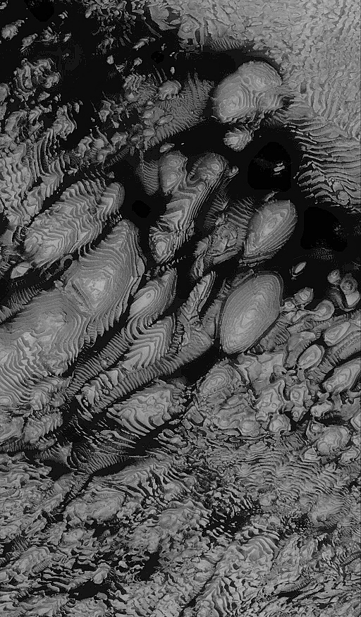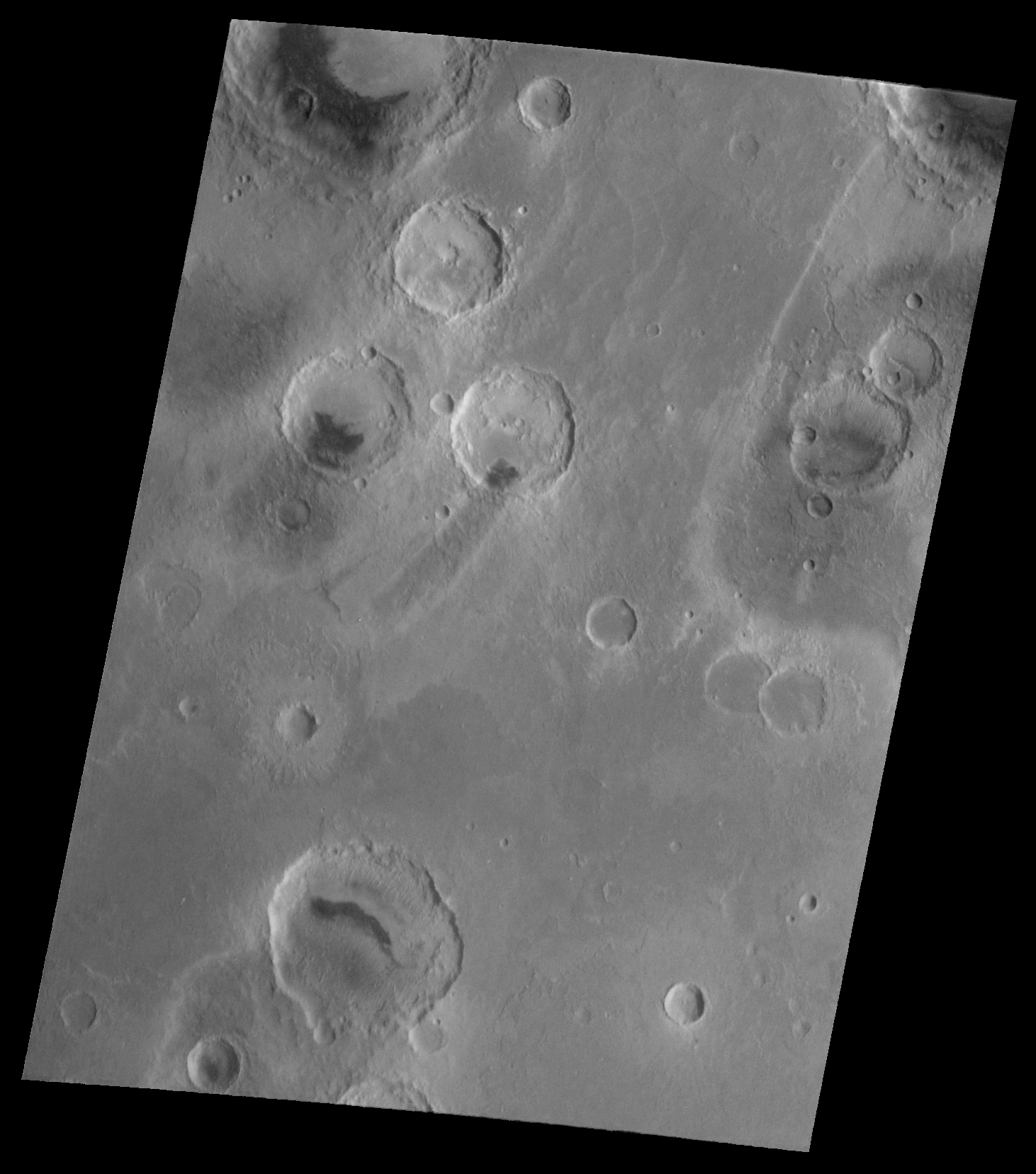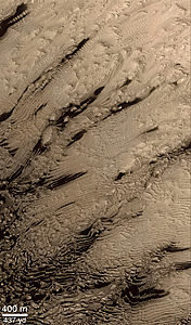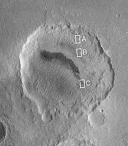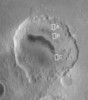 The context view (top, left) was taken by the Viking 1 orbiter in 1978; in it, north is up and sunlight illuminates the scene from the right. The three Mars Global Surveyor (MGS) Mars Orbiter Camera (MOC) narrow angle (high resolution) views (A, B, C, above) sample layer outcrops that were previously not known to exist in this crater. Each MOC image is illuminated from the left. Dark material in Pictures B and C is windblown sand; in Picture C this sand enhances the appearance of the layers.