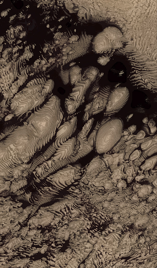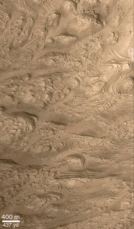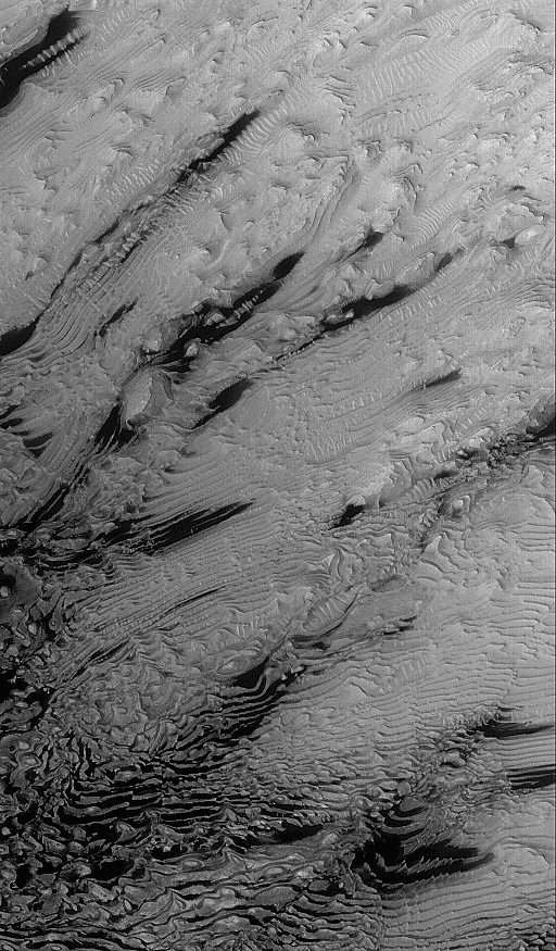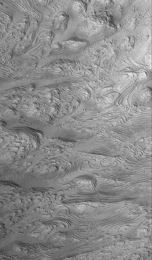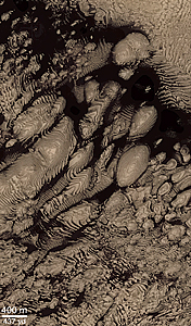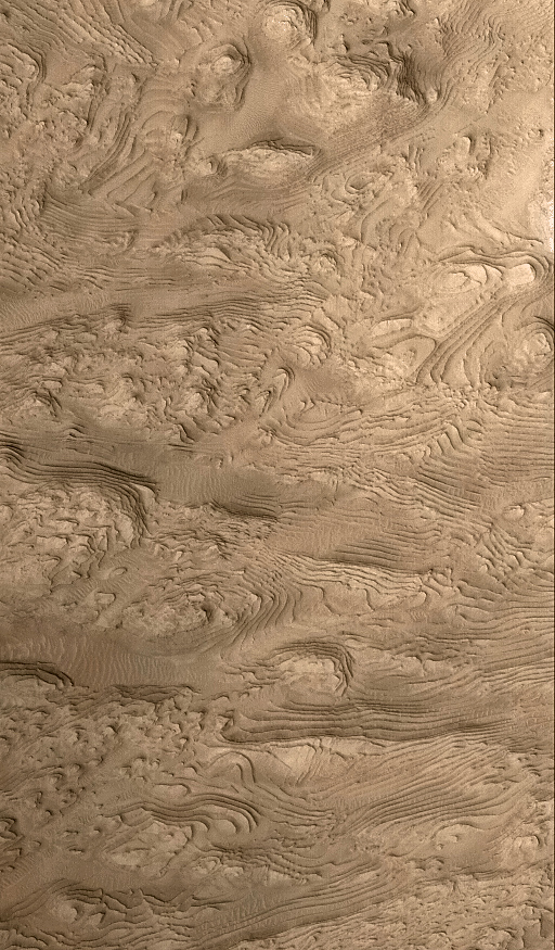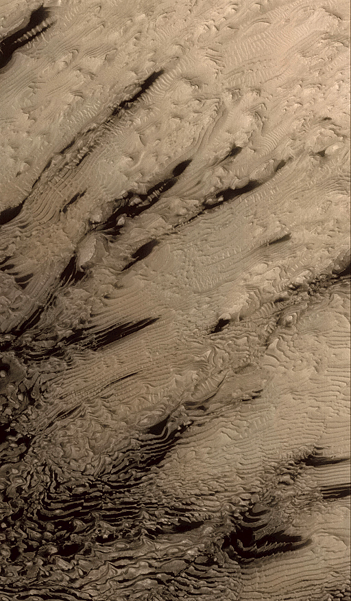 The MOC narrow angle camera only takes grayscale (black and white) pictures. To create the color versions seen here, we have taken much lower resolution red and blue images acquired by the MOC's wide angle cameras, and by the Viking Orbiter cameras in the 1970s, synthesized a green image by averaging red and blue, and created a palette of colors that represent the range of colors on Mars. We then use a relationship that correlates color and brightness to assign a color to each gray level. This is only a crude approximation of martian color and should only be considered representative of Mars. It is likely the colors would not look like this to a human observer at Mars.