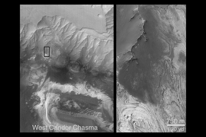 The example shown here includes two Mars Global Surveyor (MGS) Mars Orbiter Camera (MOC) images taken in July 2000. On the left is a context image showing part of the northern wall of western Candor Chasma. The black box is 3 km (1.9 mi) wide and indicates the location of the picture on the right, a high resolution view of a portion of the chasm wall. The high resolution image shows light-toned layered rock coming out of the walls. The ridge in the upper left corner of the high resolution view is also composed of the same light-toned rock, but most of the ridge is covered by a veneer (perhaps less than 1 meter (1 yard)) thick) of dark debris. Sunlight illuminates these two pictures from the upper left, north is toward the upper right. For additional information about these outcrops, see "Light-toned Layered Outcrops in Valles Marineris Walls," MOC2-263, December 4, 2000.