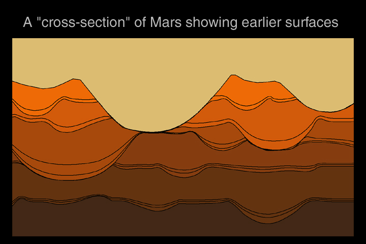 This sketch shows the initial conditions. In this case, the upper crust of Mars---portrayed by the brown and orange materials---is already layered. The "dimples" in these layers are cross-sections through buried impact craters formed by meteor impacts. In the diagrams that follow the craters and uplands at the top of this section---note the atmosphere is portrayed as golden-beige in color---will have new layered, massive, and thin mesa sedimentary units deposited upon them.