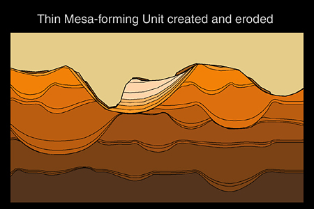 Some time after the thin layered units and thick massive units were deposited, they were eroded. In some cases, such as in Gale Crater's central mound, there were also periods of erosion that occurred between the deposition of layered and massive units. The erosion of these units is inferred to have occurred mostly at a time very early in martian history, but the fact that these materials usually have very few small meteorite impact craters on them today suggests that their erosion might be continuing today as well.