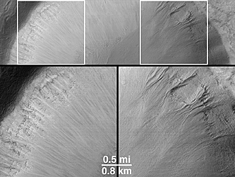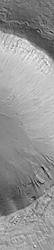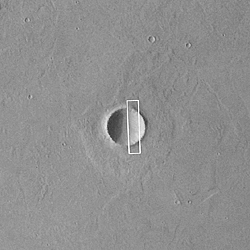 The crater is located at 36.7°N, 252.3°W. The MOC image was acquired in November 1999 and covers an area 3 km (1.9 mi) wide by 14 km (8.7 mi) long; north is toward the upper right (in A) and it is illuminated by sunlight from the lower left. The Viking 1 orbiter context image (B) was obtained in 1978 and is illuminated from the left; north is up. The MOC image has been rotated in the Explanatory Figure (C) such that north is toward the upper left, illumination is from the lower right.