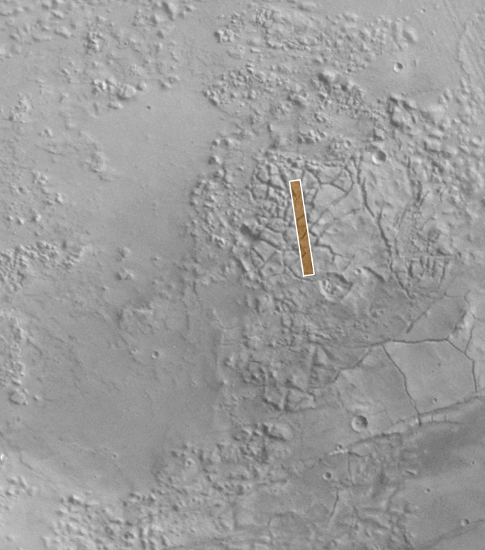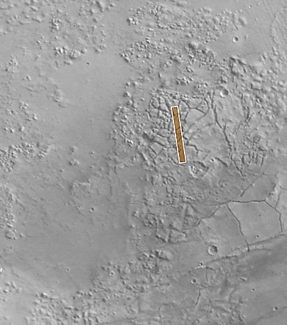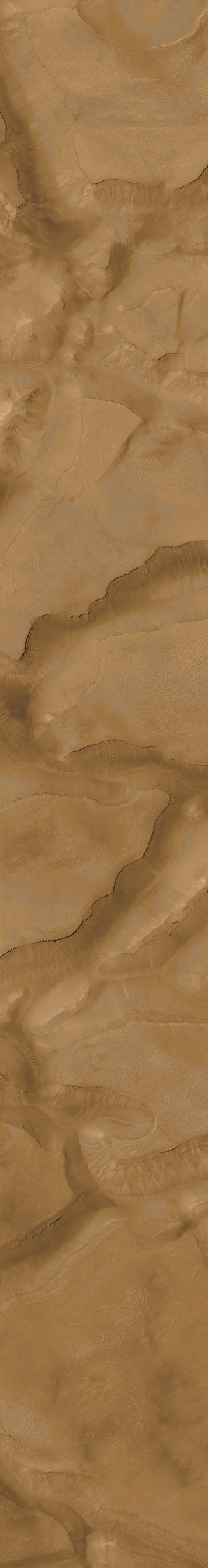 The MOC pictures were taken on January 22, 2000. The sample on the left (A) is an area 3 kilometers (1.9 miles) wide by 2.6 km (1.6 mi) high. The long view (B) covers an area 3 kilometers (1.9 miles) wide by 22.6 km (14 mi) long. Sunlight illuminates each scene from the upper left. The images are located near 37.5°S, 170.5°W. The context image (C) was acquired by the Viking 1 orbiter in 1977 and is illuminated from the upper right, north is up. MOC high resolution images are taken black-and-white (grayscale); the color seen here has been synthesized from the colors of Mars observed by the MOC wide angle cameras and by the Viking Orbiters in the late 1970s.