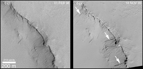 These three new slope streaks formed sometime between February 1998 and November 1999. Similar streaks were observed in the highest-resolution images from the Viking orbiters in the late 1970s, but for more than 20 years no one has known how recent these features might be, or how often they might form. Now, MOC is providing some exciting answers.