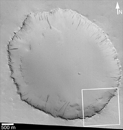 The picture at the lower left (above) shows a shallow crater located near Apollinaris Patera at 6°S, 184°W, that was photographed by MOC in February 1998. The walls of this crater exhibit approximately 100 dark streaks running down its slopes. These streaks have formed as small landslides or avalanches and are probably composed of sand and/or silt. The image is illuminated by sunlight from the lower left, and the crater is about 5 kilometers (3 miles) across. The white box shows the location of a section of the crater that was photographed again in mid-November 1999, about 92% of a Martian Year later.