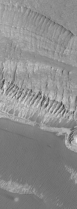 Melas Chasma is dark and covered with many parallel ridges and grooves