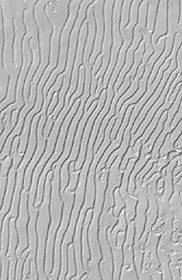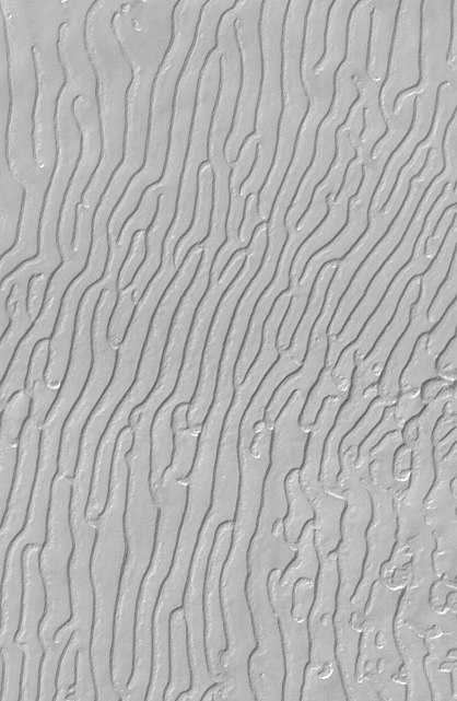 Some portions of the martian south polar residual cap have long, somewhat curved troughs instead of circular pits. These appear to form in a layer of material that may be different than that in which "swiss cheese" circles and pits form, and none of these features has any analog in the north polar cap or elsewhere on Mars. This picture shows the "fingerprint" terrain as a series of long, narrow depressions considered to have formed by collapse and widening by sublimation of ice. Unlike the north polar cap, the south polar region stays cold enough in summer to retain frozen carbon dioxide. Viking Orbiter observations during the late 1970s showed that very little water vapor comes off the south polar cap during summer, indicating that any frozen water that might be there remains solid throughout the year.