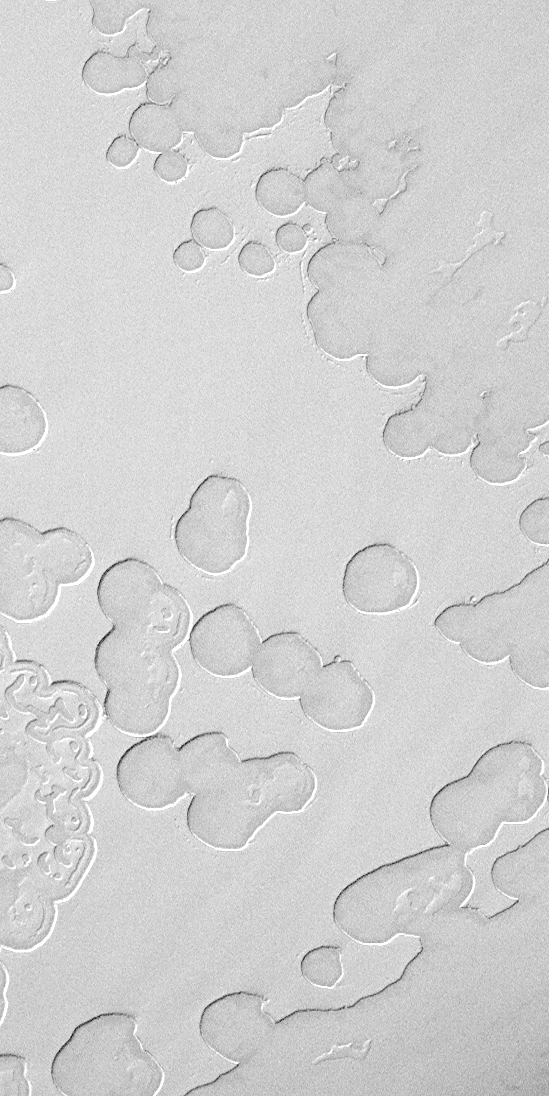 Some of the surface of the residual south polar cap has a pattern that resembles that of sliced, swiss cheese. Shown here at the very start of southern spring is a frost-covered surface in which there are two layers evident--- a brighter upper layer into which are set swiss cheese-like holes, and a darker, lower layer that lies beneath the "swiss cheese" pattern. Nothing like this exists anywhere on Mars except within the south polar cap.