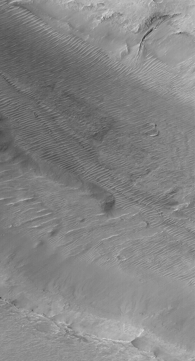 The image is located near 29.4°S, 39.1°W. North is toward the upper right and illumination is from the upper left. Aspect ratio is 1.5:1, thus the scale bar in the labeled image (middle) shows different vertical and horizontal scales. The picture covers an area 3 km (1.9 mi) by 6.5 km (4 mi) and is a subframe of M07-00752. To see what the raw MOC image data look like, visit the newest data releases (for Mission Subphases M07 - M12, covering September 1999 through February 2000) in the MOC GALLERY at http://www.msss.com/moc_gallery/.