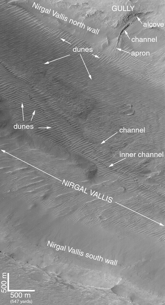 The wall of Nirgal Vallis shows something else---a much more recent "gully" with an alcove at the top of the slope, a channel, and an apron that partly covers some of the adjacent sand dunes. This gully is inferred to be much younger than the channels running down the center of Nirgal Vallis, because these channels are covered by dunes, while the gully's apron covers the dunes. This gully feature is one of many reported by MGS MOC scientists in June 2000 as being the possible result of geologically recent groundwater seepage and mud or debris flow. (See: "MOC Images Suggest Recent Sources of Liquid Water on Mars.").