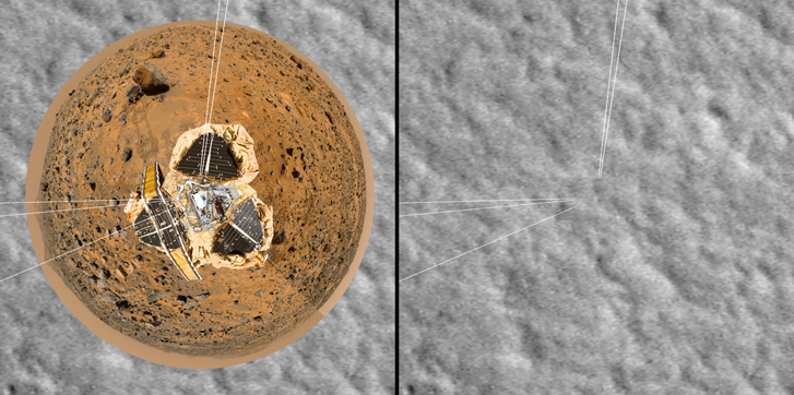 From the radiolocation analysis described above, we will have a good place to start looking for features to match between early panorama images taken within the first few sols of surface activity and orbiter images taken before landing. This process is pretty straight forward in areas where good relief is visible, but in areas of very low relief or homogenous morphology (every place looks the same), sight-line analysis can be complicated or even defeated. Below we show an example of sightline analysis for the 1997 lander, Mars Pathfinder.