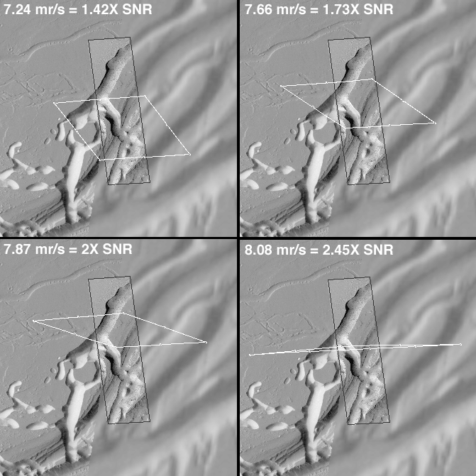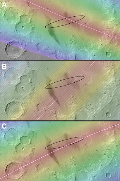 Figure 2 shows single-location maps of the differences between the synthetic and "actual" values (generated in a test of the system) for three times when MGS was approaching (A), passing (B), and receding (C) from the landing location. The three examples were taken near the limits of communication (just after contact is established and just before it is lost). Faint gray lines that alternate light and dark indicate contours of values offset from their neighbors by 256. The white lines are the locus of points along which the minium differences occur--the lander lies somewhere along each white line.