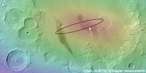 The Mars Relay (MR) system acquires three doppler measurement every BTTS (16 seconds). During the MGS's pass over the landing site during MER Entry, Descent, and Landing (EDL), when the MER is communicating to the MR, only about 4 or 5 BTTS's will be recorded, or perhaps 12-15 doppler measurements. To analyse the doppler measurements, Scott Davis of MSSS devised a simple process: for each time along the MGS orbit where a doppler measurement is made, he calculates what the doppler signal would be from each longitude, latitude, and altitude within the landing ellipse if that location were in fact the actual location of the lander. He then compares these synthetic values with the actual value measured at that time by the MR. Figure 1 shows a typical MGS early-morning orbit pass by the MER-A landing site in Gusev Crater