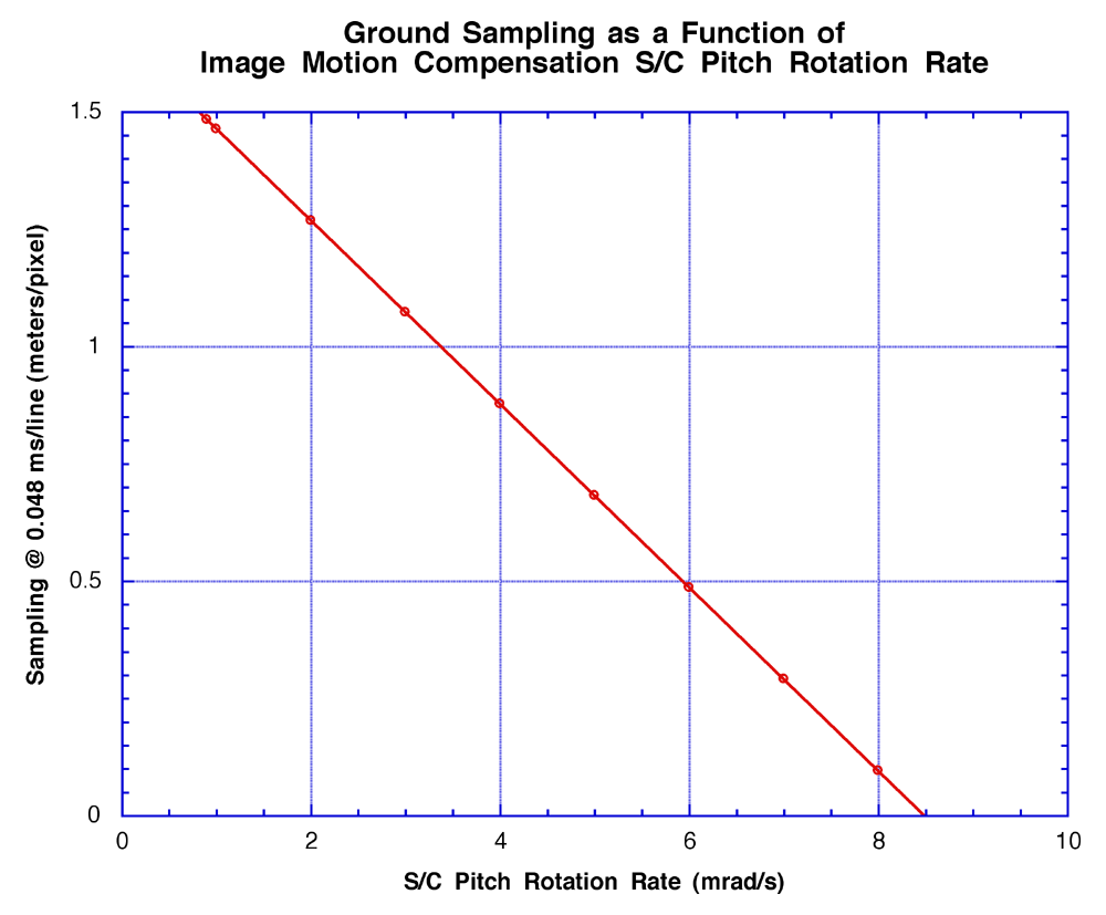 By pitching the spacecraft faster than it needs to just maintain nadir orientation, the "effective" ground speed can be reduced by a proportionally larger amount than the 0.3 km/sec required for nadir pointing. Figure 9 shows the relationship between rotation rate in mrad/sec and the equivalent spatial sampling at the MOC's nominal line rater of 0.48 msec/line. At 5 mrad/sec, the sampling scale is about 70 cm/pixel, at 6 mrad/sec it is 50 cm/pixel, and at 7 mrad/sec, the sampling is 30 cm/pixel. MOC resolution is limited by diffraction at about 70 cm/pixel. However, the 2005 Mars Reconnaissance Orbiter (MRO) High Resolution Imaging Science Experiment (HiRISE) experiment is predicated on using internal image motion compensation to provide sampling at smaller scales than its diffraction limit and using image processing techniques to improve the resolution; these same techniques can be employed on MOC images taken at sampling scales smaller than 70 cm. In addition, rather than keeping the sampling rate at 0.48 msec/line, we can increase the line time to collect more photons, thus increasing our signal-to-noise (SNR). A practical compromise between sampling and SNR is to maintain a ground sampling distance of 50 cm (oversampling the MOC diffraction point spread function) and increasing the line time by a factor of 3 (this improves SNR by 3½, or 1.73).