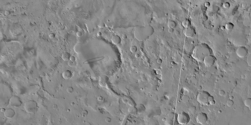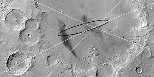 Figure 1: Typical "AM" pass of MGS relative to MER-A landing site. MGS would follow the white line from north (top) to south at around 2 AM local solar time. |