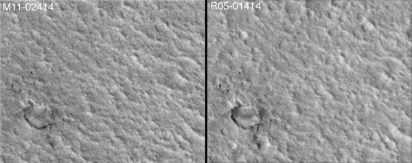 Figure 11: Comparison of "normal" MOC high resolution image, taken at roughly 1.4 m/pixel and shown here at 0.6 m/pixel, and "IMC" image taken at a ground sampling distance of 0.5 m/pixel and shown here at 0.6 m/pixel. |