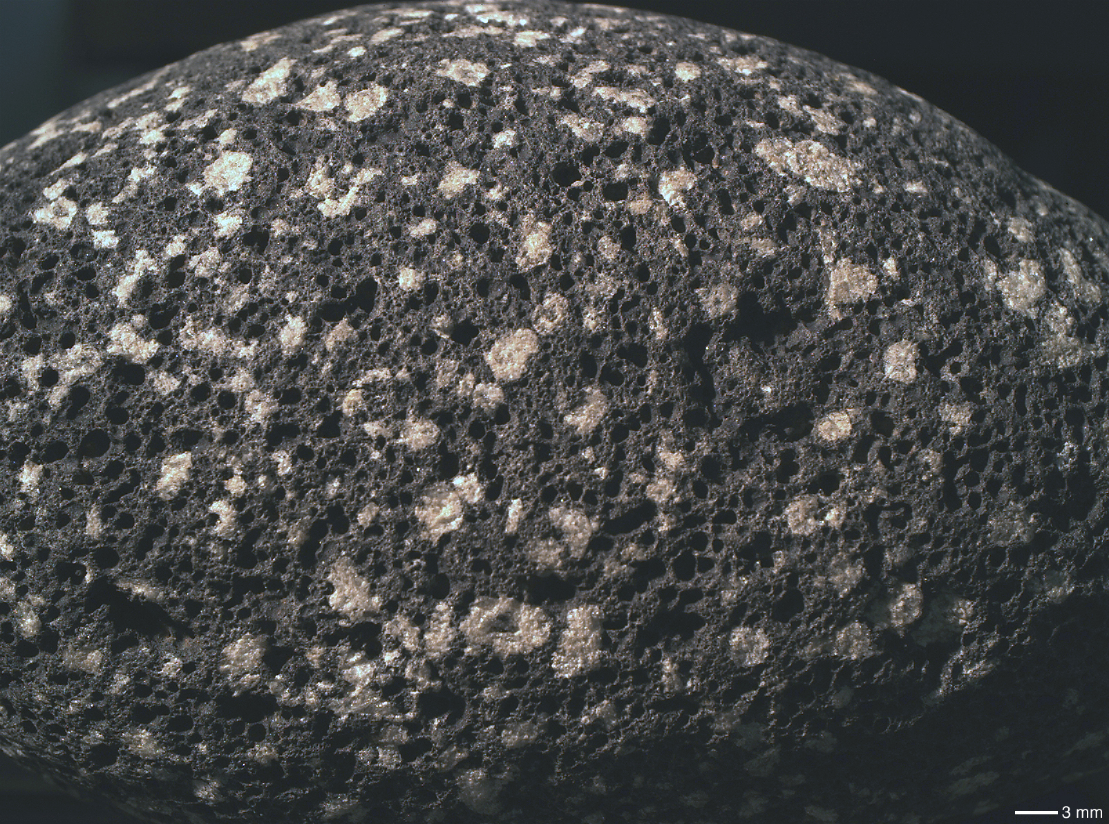 This picture shows a MAHLI view of a portion of a rounded basalt cobble collected in Iceland by MAHLI Deputy Principal Investigator, Mike Malin. The large white-ish features are crystals of the mineral, plagioclase, that crystalized in the magma before the basalt lava was erupted onto the Earth’s surface. The holes in the cobble result from gas bubbles in that lava. This is a MAHLI view of the same rock that the MSL MARDI imaged in June 2008 (see Figure 3 of the 17 July 2008 MARDI Press Release). The rock in this case was imaged at a scale of ~49 microns per pixel. The 3 mm scale bar equals about 0.12 inch. The picture was taken during MAHLI calibration activities on 30 September 2008. Image credit: NASA/JPL-Caltech/Malin Space Science Systems |